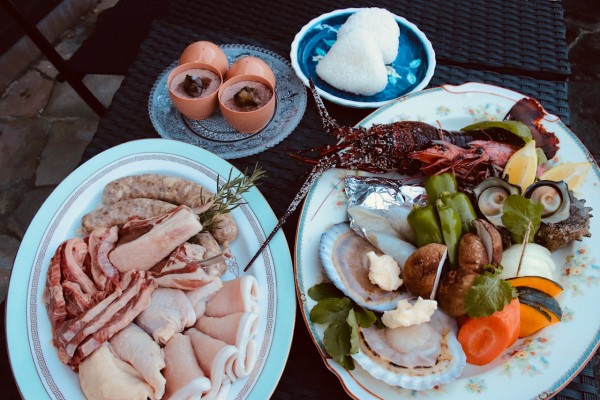 Sample Menu JPY20000 for 2persons (Wagyu beef 200g, Hakone mountain pork 200g,Local chicken 200g, Sausage 2, Spiny Lobster 1, Turban shell 2, Scallops 2, Squid, Seasonal Vegetables, Rice boll 2, Dessert 2)